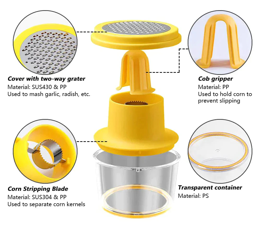 Ein Alleskönner in der Küche: Hobel, Schäler, Ingwerschärfer und Maiskornabscheider in einem, mit integriertem Messbecher und Reibe. Die ergonomische, gebogene Form passt perfekt zur Handfläche und das rutschfeste Muster sorgt für komfortablen Halt und verhindert ein Abrutschen. Mit diesem Tool wird das Ablösen von Maiskörnern spielend einfach – für perfekte Ergebnisse jedes Mal!