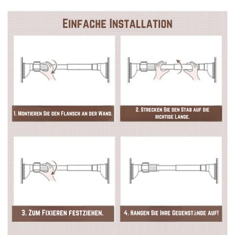 Einfache Montage: Kein Werkzeug nötig – die Stange lässt sich in wenigen Handgriffen installieren und bei Bedarf wieder entfernen.