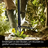 Wie funktioniert der RootPuller?Einfach auf das Unkraut setzen, mit dem Fuß heruntertreten und ziehen – die Wurzel kommt komplett mit heraus.