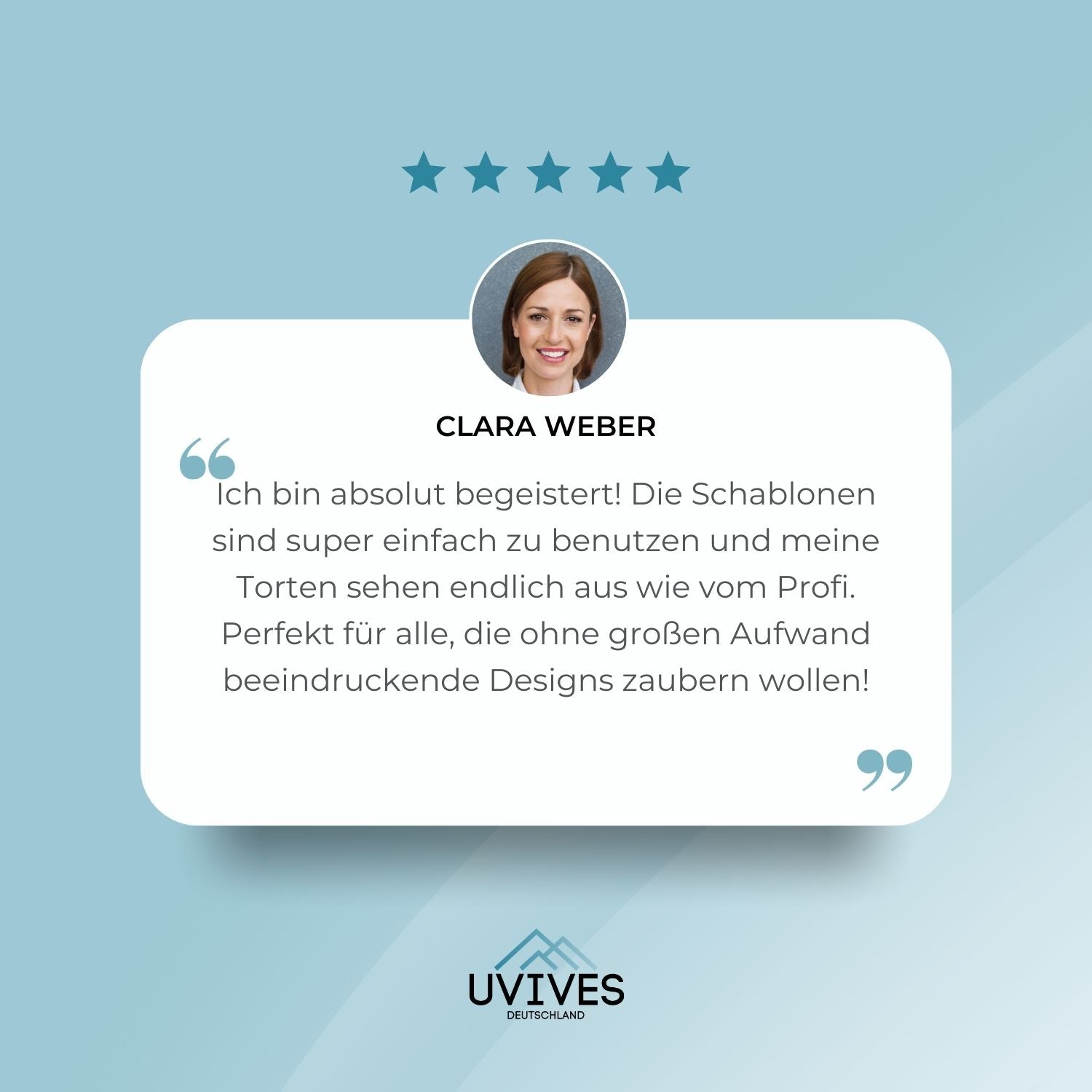 ✓ Einfache Anwendung - Schablone auflegen, dekorieren und genießen – ideal für Anfänger und Profis.✓ Langlebiges Material - Hergestellt aus lebensmittelechtem, umweltfreundlichem PET-Kunststoff, sicher und wiederverwendbar.✓ Vielseitig einsetzbar - Perfekt für Torten, Kekse, Schokolade oder sogar kreative Malprojekte.